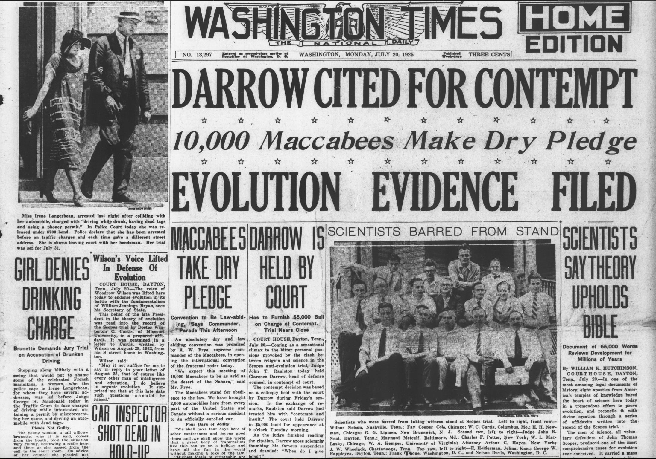 On July 20, 1925 the Washington Times published three front page stories about Tennessee v. Scopes—along with Prohibition, crime, and a woman who was arrested for drinking and driving, the Scopes Trial raised sensational questions about modern American life.