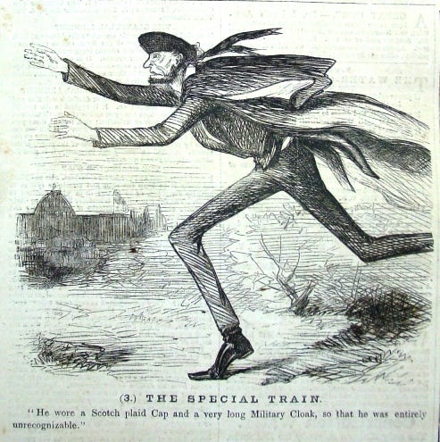 A cartoon of Lincoln as he was on his way to his inauguration on a special train in February 1861.