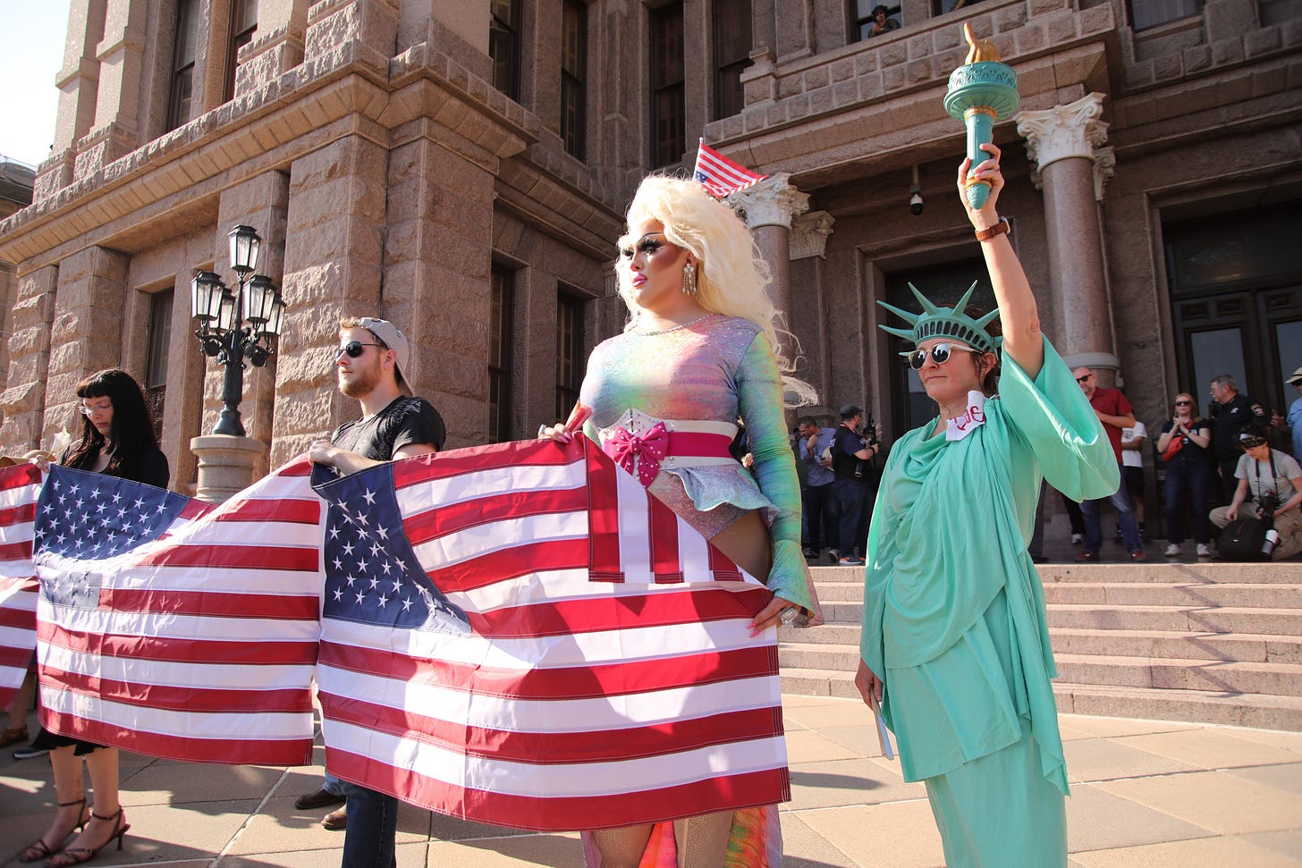 Protesters, including a drag performer and a woman dressed as the Statue of Liberty, protest Donald Trump’s policies at a No Kings rally at the Capitol building in Austin, TX, June 14, 2025. Photo credit: Vic Hinterlang/Shutterstock