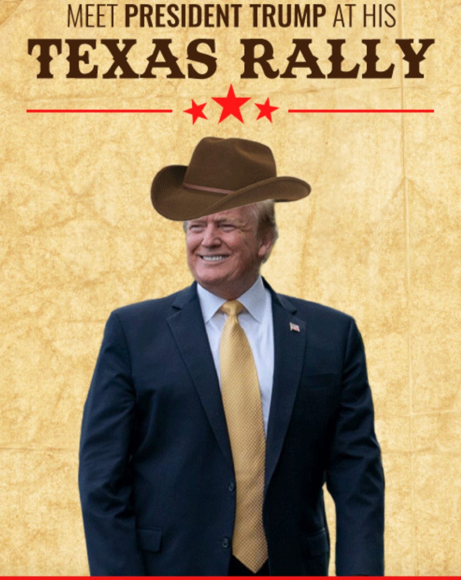 Department of Political Spam. I suspect that it is the right-wing social media platform Gab that has returned my email address to the Trumposphere, but I wanted to share the image I received from the Former Guy prior to his recent rally in the Lone Star state. What astonishes me is not that Donald Trump would never be caught dead wearing a cowboy hat, but that he didn’t even pose for the image. The topper is Photoshopped so badly it communicates a thinly-veiled contempt for his own supporters.