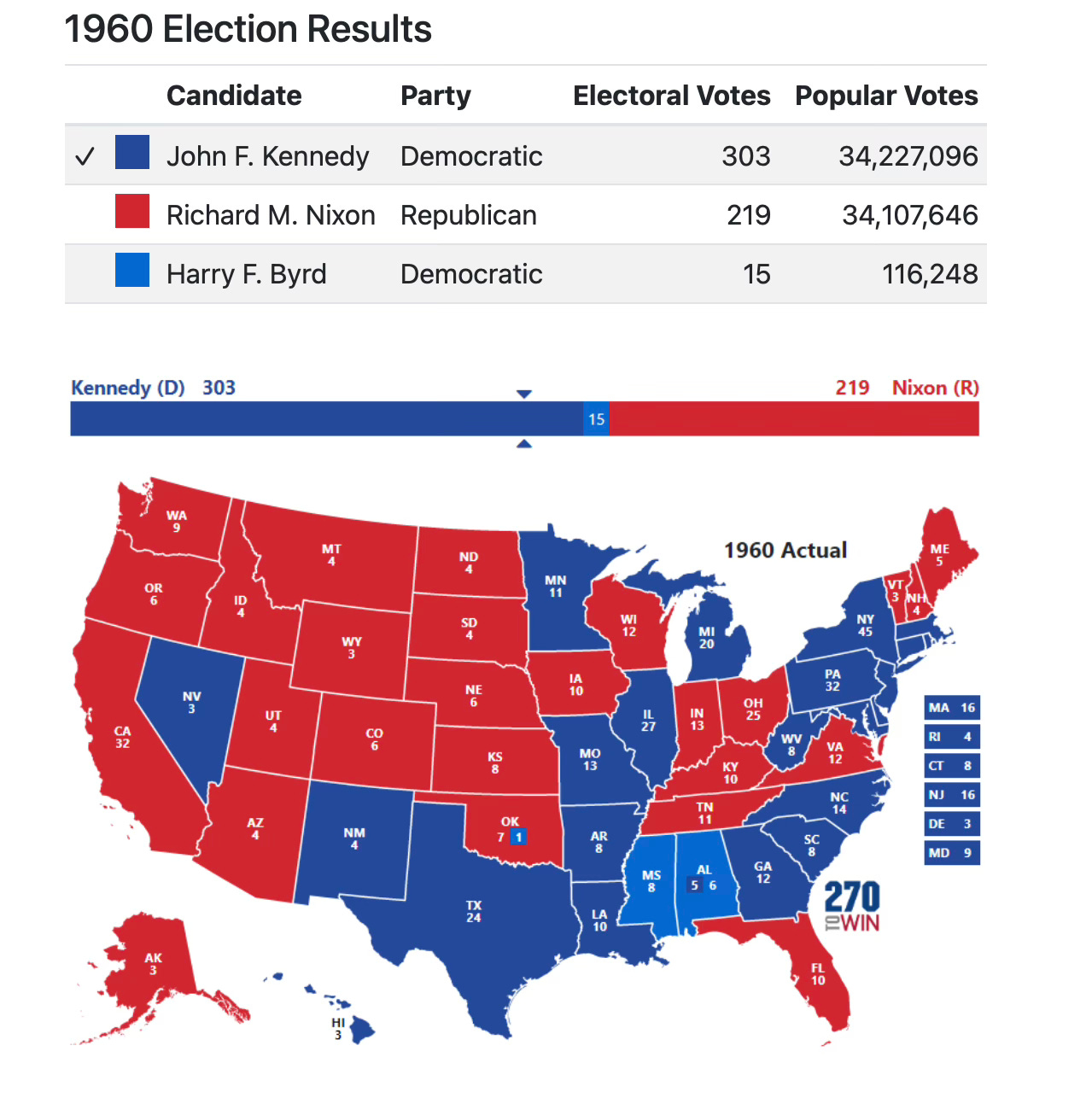 For example, John F. Kennedy (who detested his own Vice-Presidential pick, Lyndon Johnson) needed to hold the Democratic South, a conservative, segregationist wing of the party that was slipping away due to growing support among Democrats for Black civil rights. In fact, there are those who argue that choosing Johnson secured Texas, and the election, for JFK (you will also note in the illustration below that Richard Nixon won California in 1960, and not just because he was from there, but because California was very conservative.)